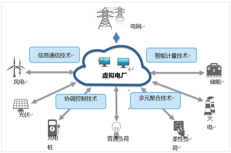通過(guò)智能調(diào)控、通信技術(shù)整合各種形式的分布 式發(fā)電、負(fù)荷、儲(chǔ)能等資源,作為一個(gè)調(diào)控性能好的“虛擬電廠”來(lái)參與電力供需調(diào)節(jié)。