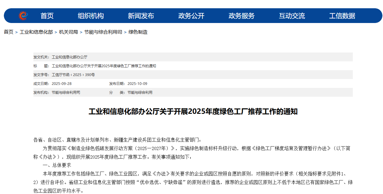 工業和信息化部辦公廳關于開展2025年度綠色工廠推薦工作的通知